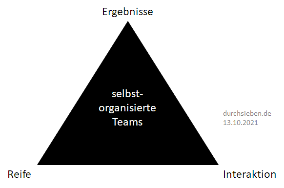 Ich möchte meine drei Elemente selbst-organisierter Teams vorstellen: Reife der Mitglieder, deren Art der Interaktion und die Ergebnisse die sie Erzielen. Nur ein Team welches diese Elemente ausbalanciert miteinander kombinieren kann, wird die Voraussetzungen und damit auch die Legitimation für Autonomes handeln erhalten. (eigene Überlegungen)